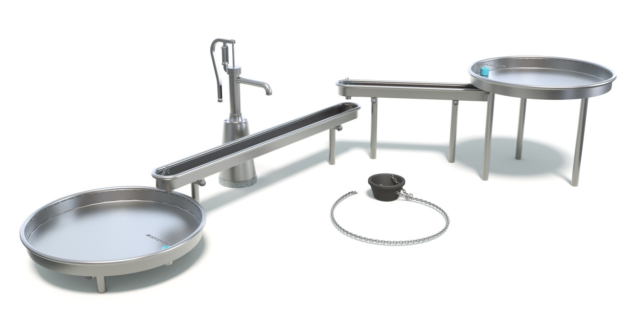 Featuring a manual water pump, Relay invites kids to scoop water from the fixed bucket and pour it into the top tray to get everything moving.