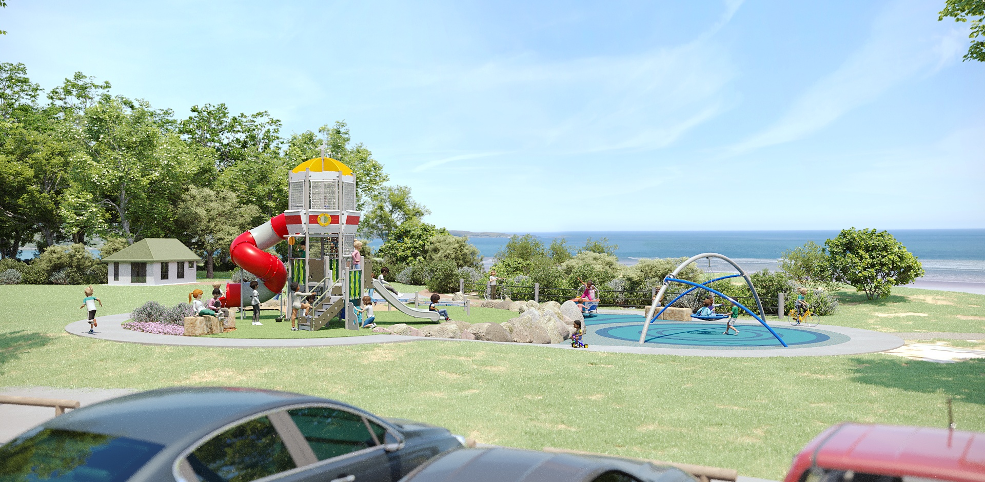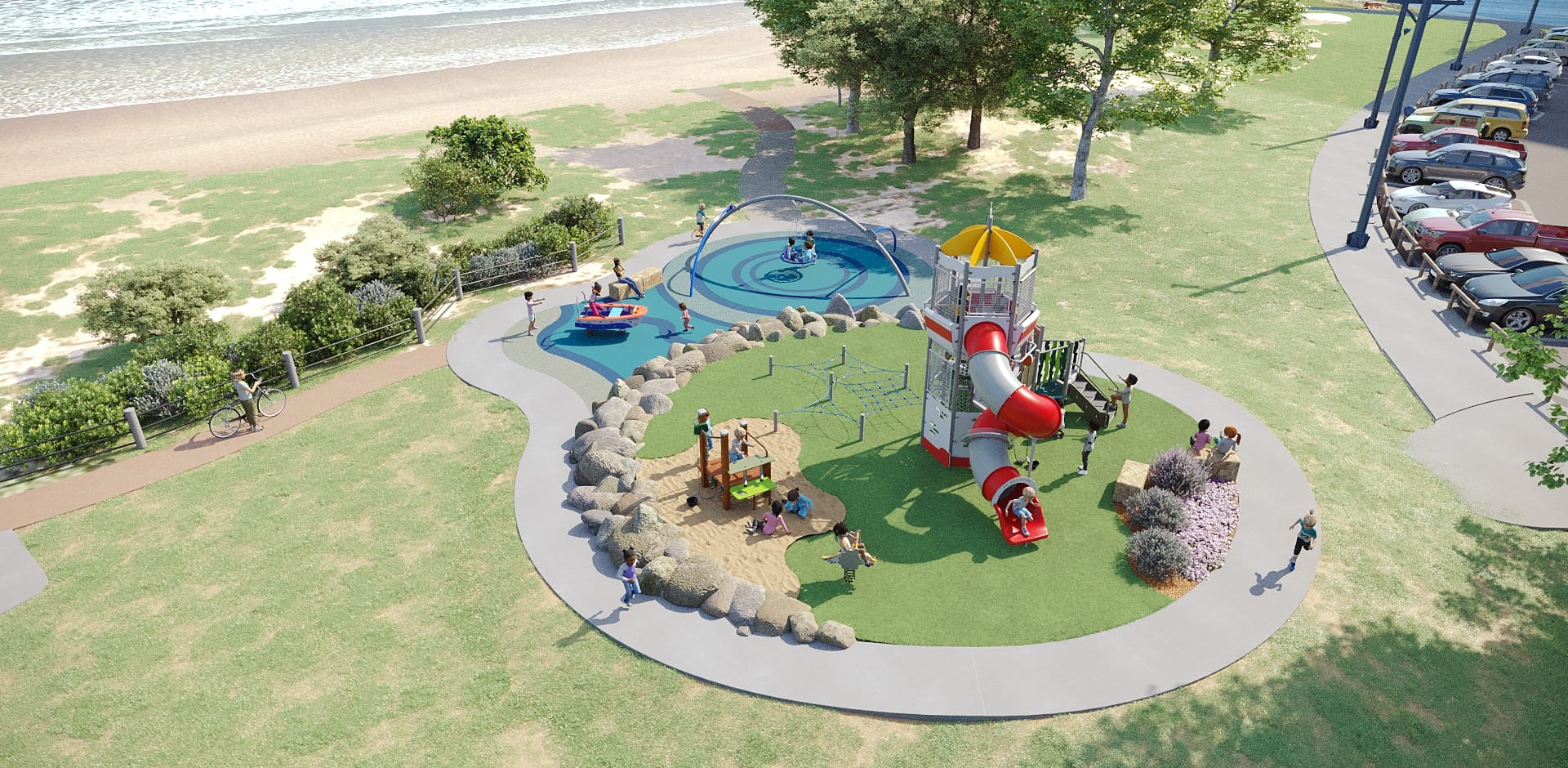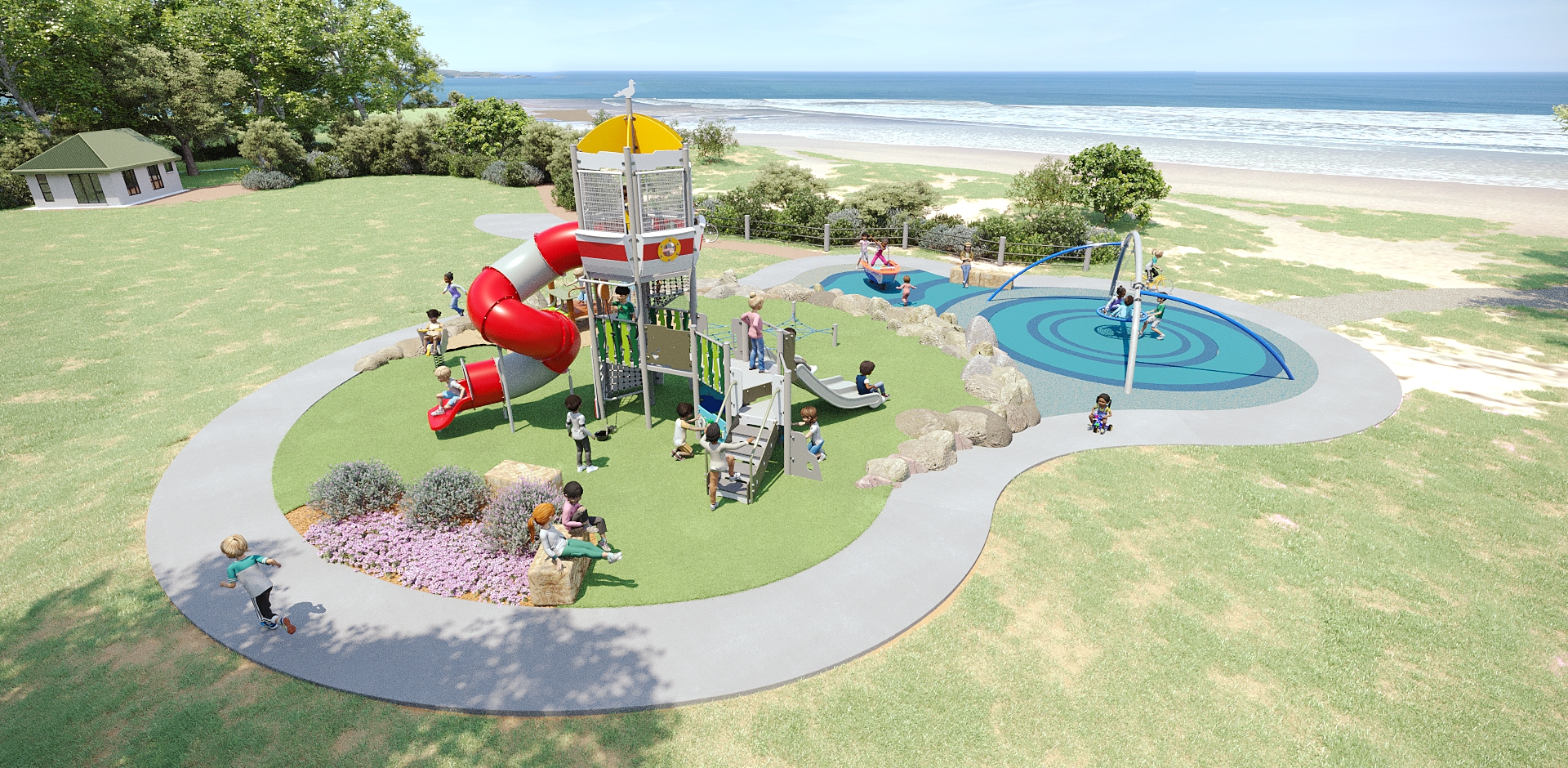 At the heart of the playground stands a striking lighthouse feature. Playful, dynamic, and brimming with nautical character. Every element, from themed fun to sand features, is designed to bring the coast into the world of play. It’s a space where waves of imagination roll in with every step.